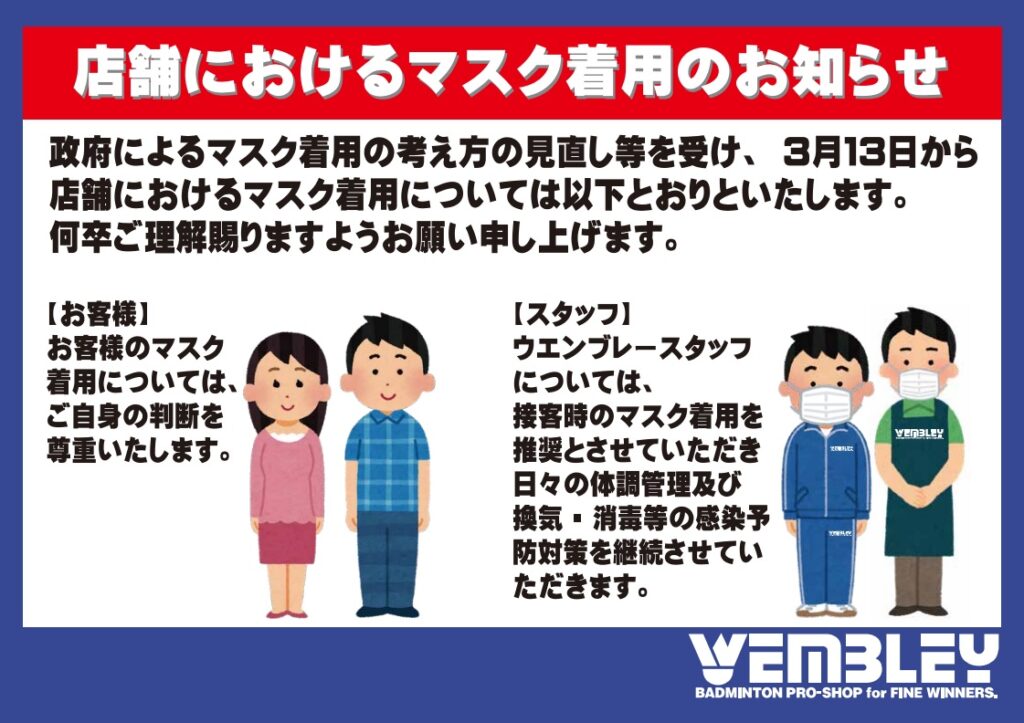 政府によるマスク着用の考え方の見直し等を受け、3月13日から店舗におけるマスク着用については以下とおりといたします。