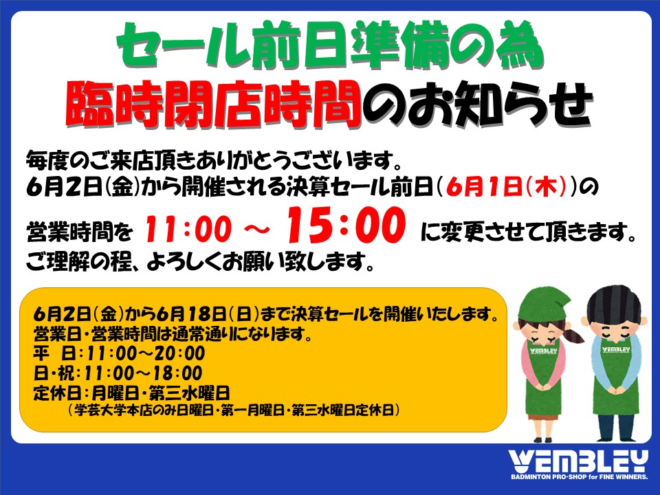 セール前日準備の為、臨時閉店時間のお知らせ X Facebook LINE コピー 2023.05.26 こんにちは☆ 6月1日(木)は、セール前日準備の為、15時閉店とさせて頂きます。 みなさまが、安心してご来店して頂けるために万全の準備をさせて頂きます。 6月2日(金)からの、ウエンブレー決算セールにどうぞお越しください。 皆様のご来店ウエンブレースタッフ一同心よりお待ちしております。