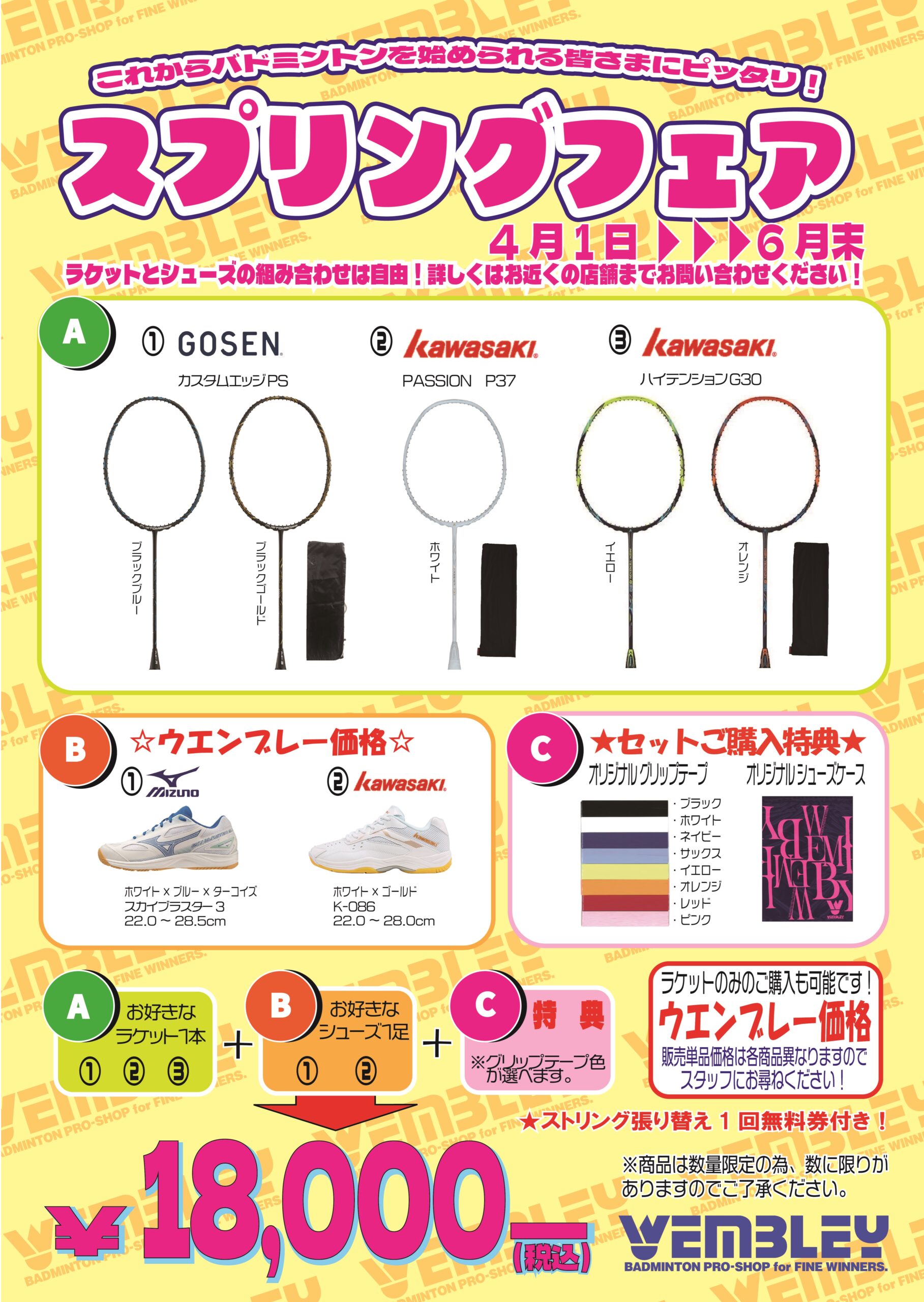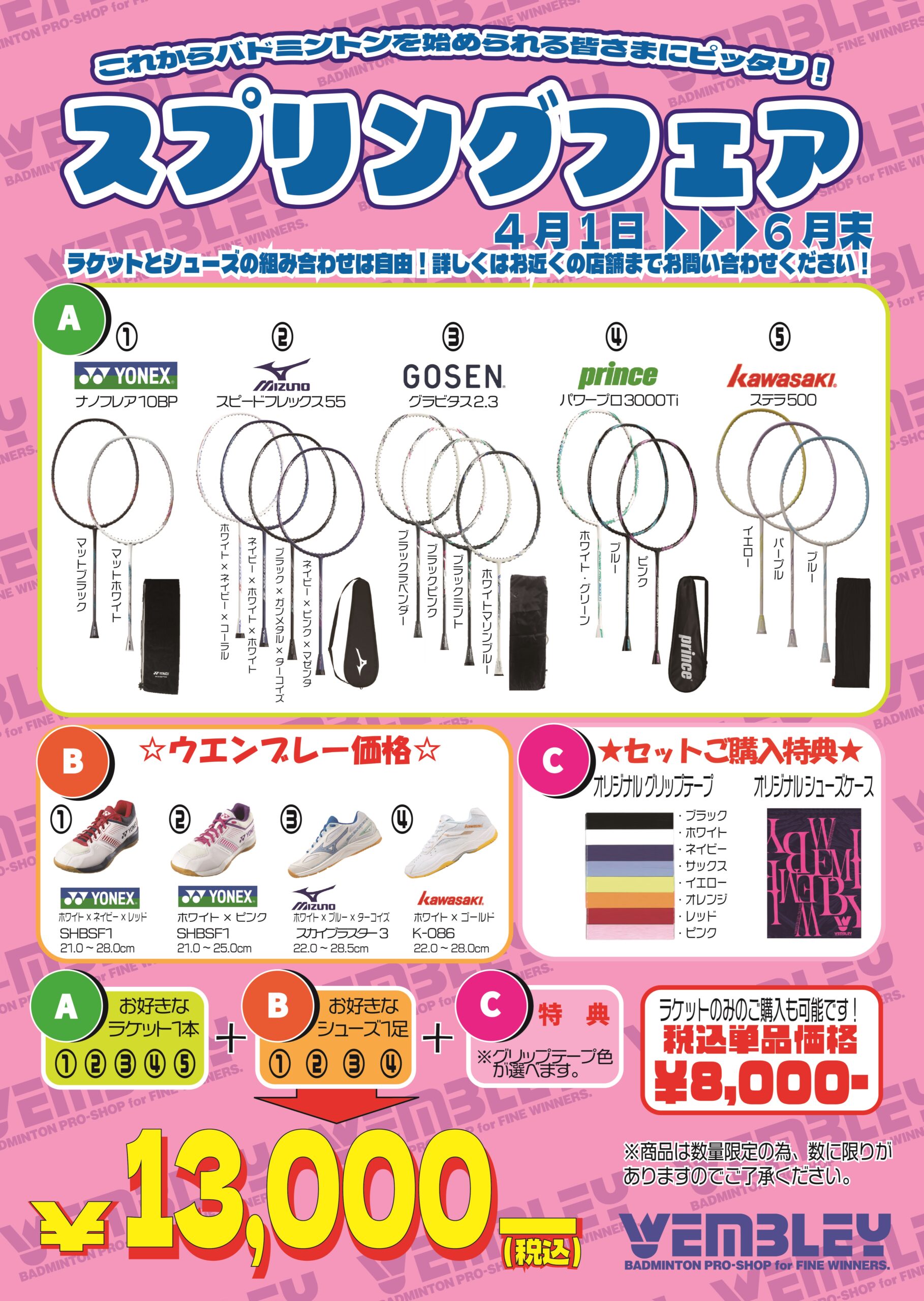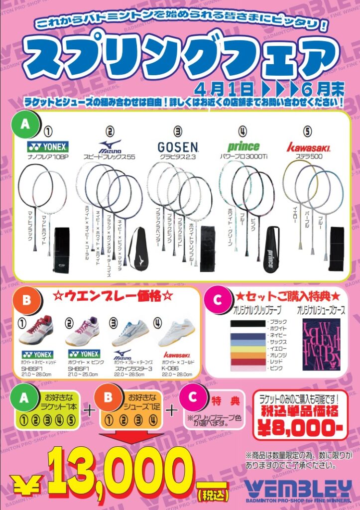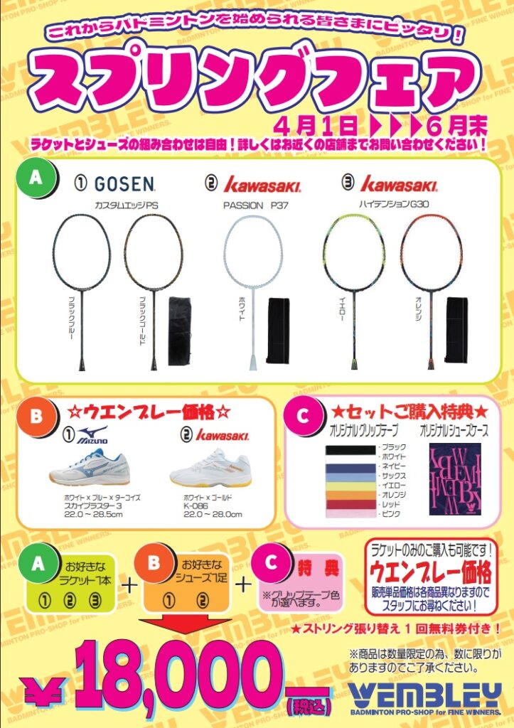 スプリングフェアのお知らせ X Facebook LINE コピー 2024.04.012024.06.15 こんにちは☆ 今年も4月よりスプリングフェアが始まりました!これからバドミントンを始める方は是非ウエンブレーで道具を揃えてバシバシ練習しちゃいましょう☆ ラケットとシューズがお得なセットになっているのですぐにバドミントンを始められます!! 全店舗で実施いたしますのでお近くの店舗までお問い合わせください! 2024スプリングフェア申込用紙ダウンロード ※無くなり次第終となりますので、お早めにご確認お願い致します。
